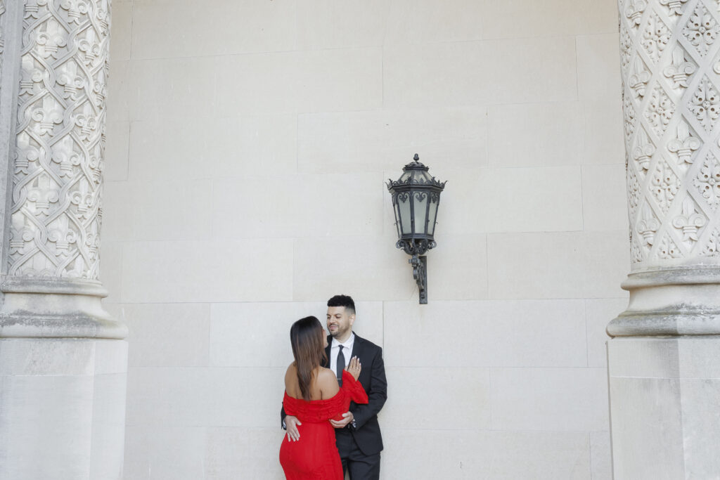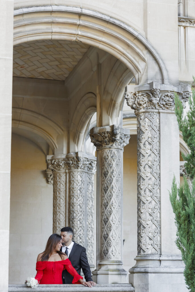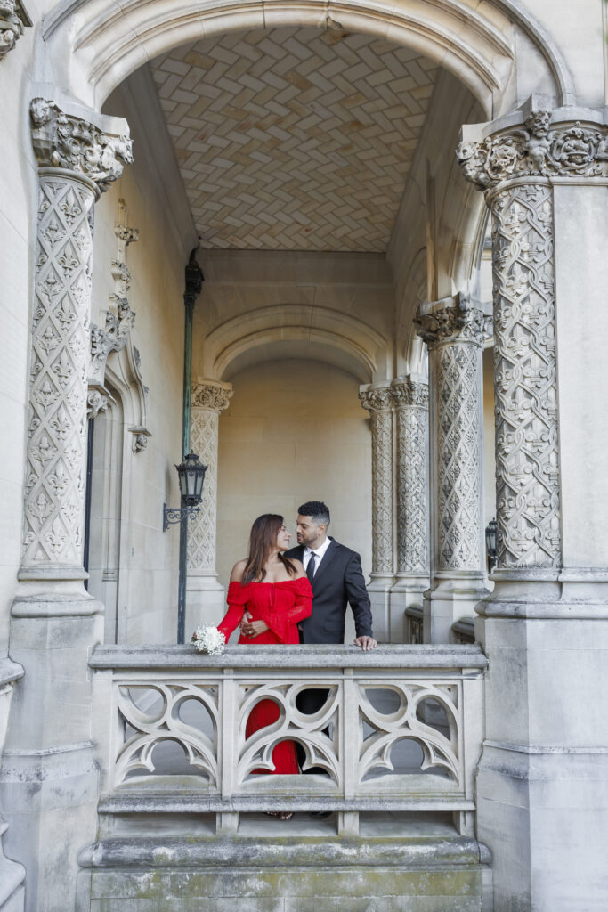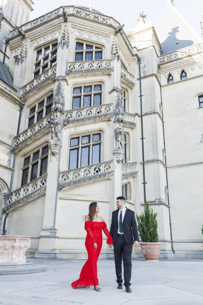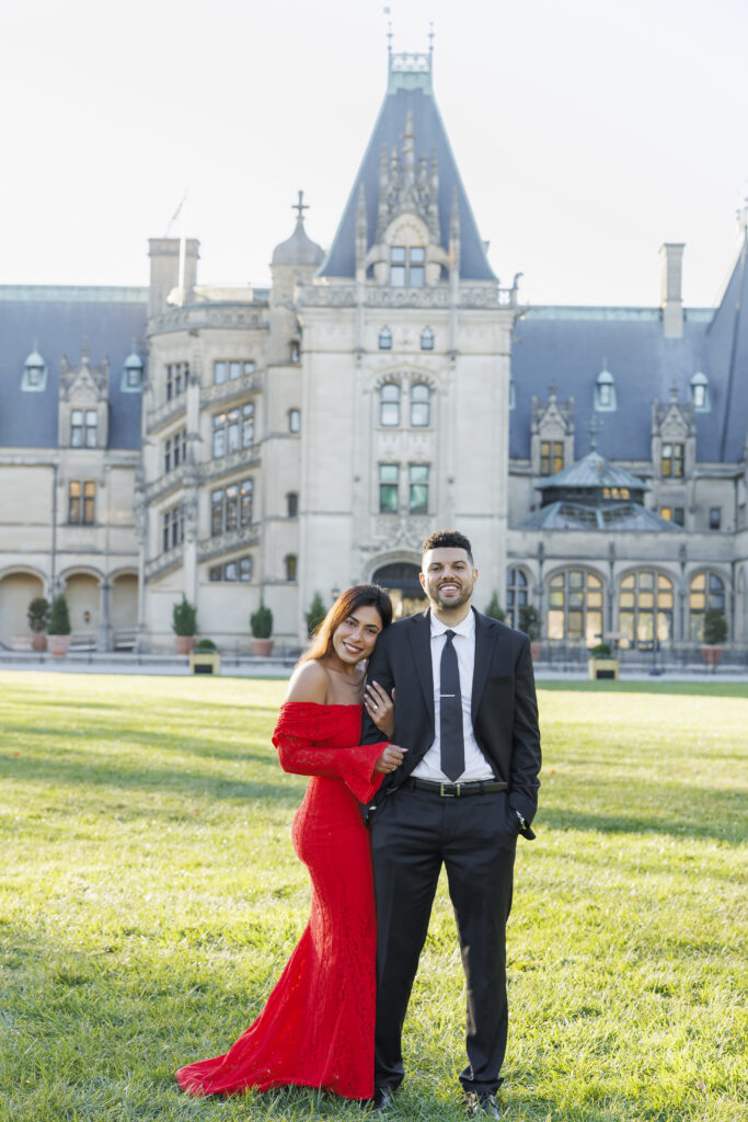 Vijaya’s mermaid-style red dress with intricate lace overlay details made a stunning statement against the neutral tones of the Biltmore grounds, adding a sense of drama and elegance that photographed beautifully. Paired with Brendon’s tailored classic suit, their look felt cohesive, refined, and perfectly suited for a luxury engagement session at the Biltmore Estate.