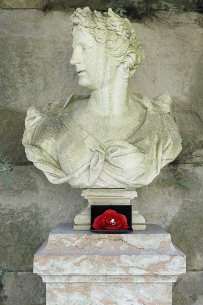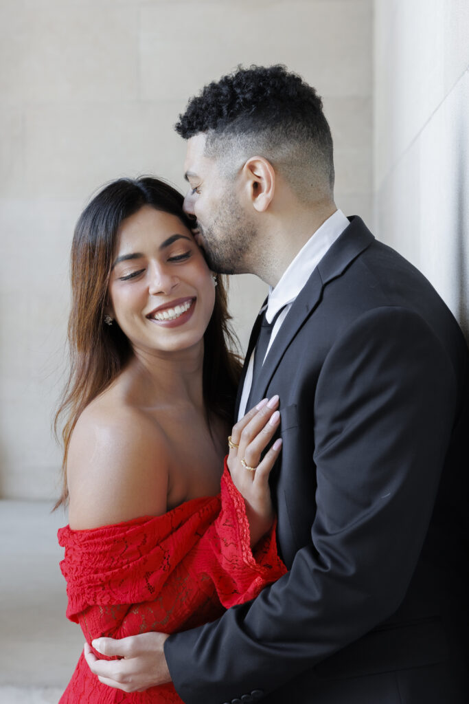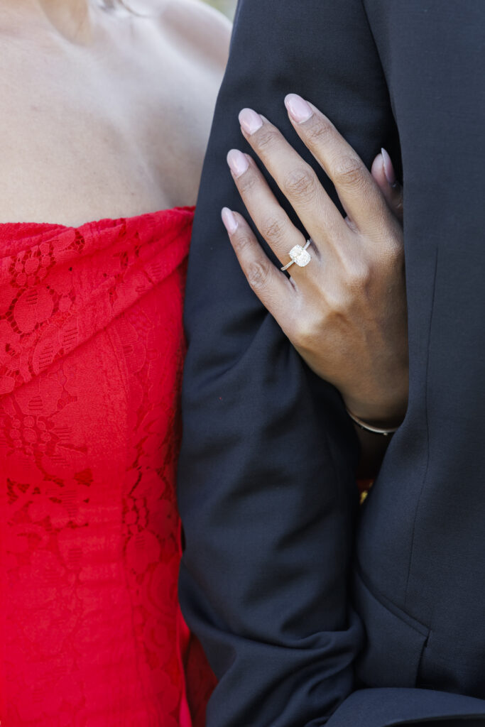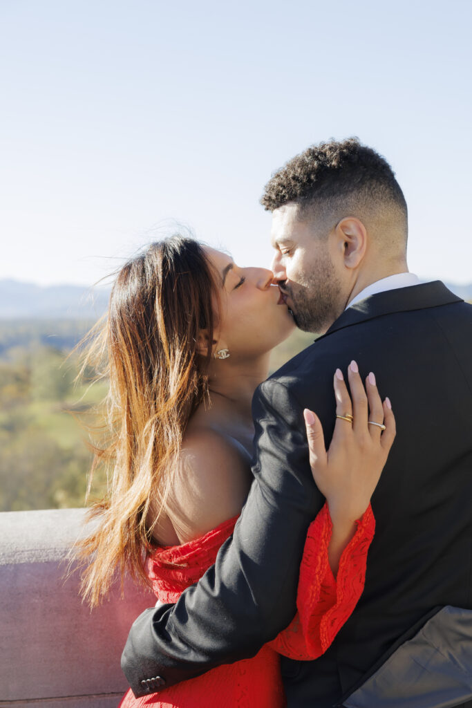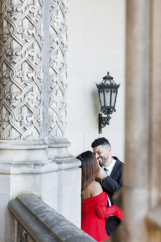 Vijaya’s mermaid-style red dress with intricate lace overlay details made a stunning statement against the neutral tones of the Biltmore grounds, adding a sense of drama and elegance that photographed beautifully. Paired with Brendon’s tailored classic suit, their look felt cohesive, refined, and perfectly suited for a luxury engagement session at the Biltmore Estate.