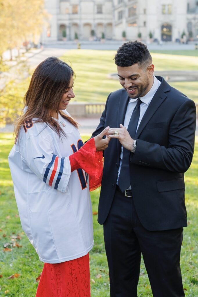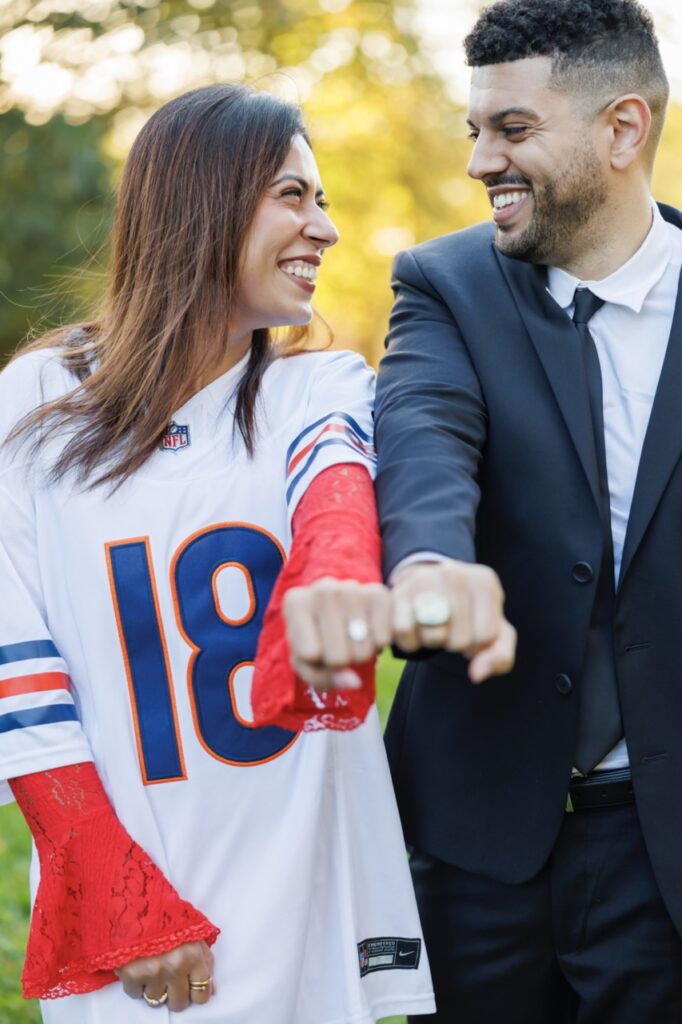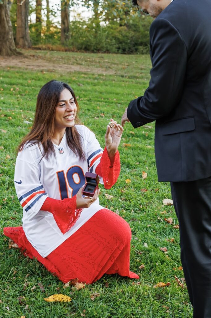 But when it came time to plan her proposal surprise, Vijaya did something incredibly meaningful. She secretly purchased a Chicago Bears championship ring, packed Brendon’s Bears jersey, and planned a moment that would turn into one of the most memorable chapters of their story. Vijaya got down on one knee and “proposed” back — officially accepting the Chicago Bears as her team, too.